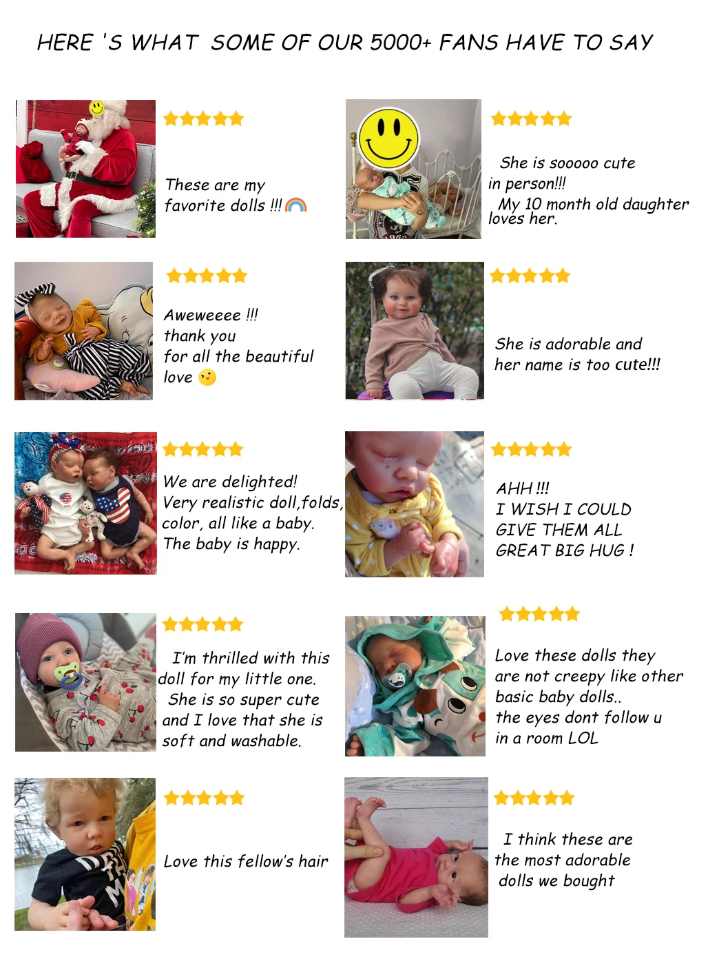 Attention: Props shown in the pic are Not Included in the package. Some of the accessories we used for shooting are sold in our accessories page separately. And Don't worry, all our dolls are dressed in Real Baby Clothes designed by ourselves.